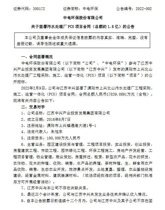 2022年2月9日,公司與江蘇中興簽署了溧陽市上興北山污水處理廠工程采購、施工、運營一體化(PCO)項目合同,合同總額人民幣約1.78億元(含稅)。